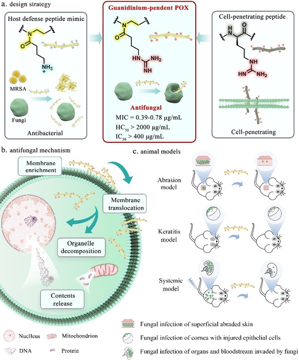 该研究团队在前期研究中首次发现聚(2-噁唑啉)可以作为新一类的功能性多肽模拟骨架结构,并以侧链氨基功能化的聚(2-噁唑啉)模拟宿主防御肽获得高效抗耐药细菌聚合物(Angew. Chem. Int. Ed. 2020, 59, 6412-6419, VIP 论文, inside cover, 高被引论文)。在前期工作的基础上,近日研究团队受细胞穿透肽启发,通过模拟宿主防御肽设计了一种短链长的胍基功能化聚(2-噁唑啉),能够有效穿透真菌细胞膜从而杀死真菌,实现了体外高效的选择性抗真菌功能和体内出色的抗耐药真菌感染治疗效果,为设计新型高效选择性抗真菌化合物以对抗耐药真菌感染提供了一种新策略。