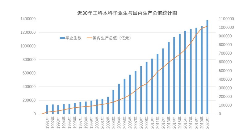 图3:‍近30年工科本科毕业生与国内生产总值统计图