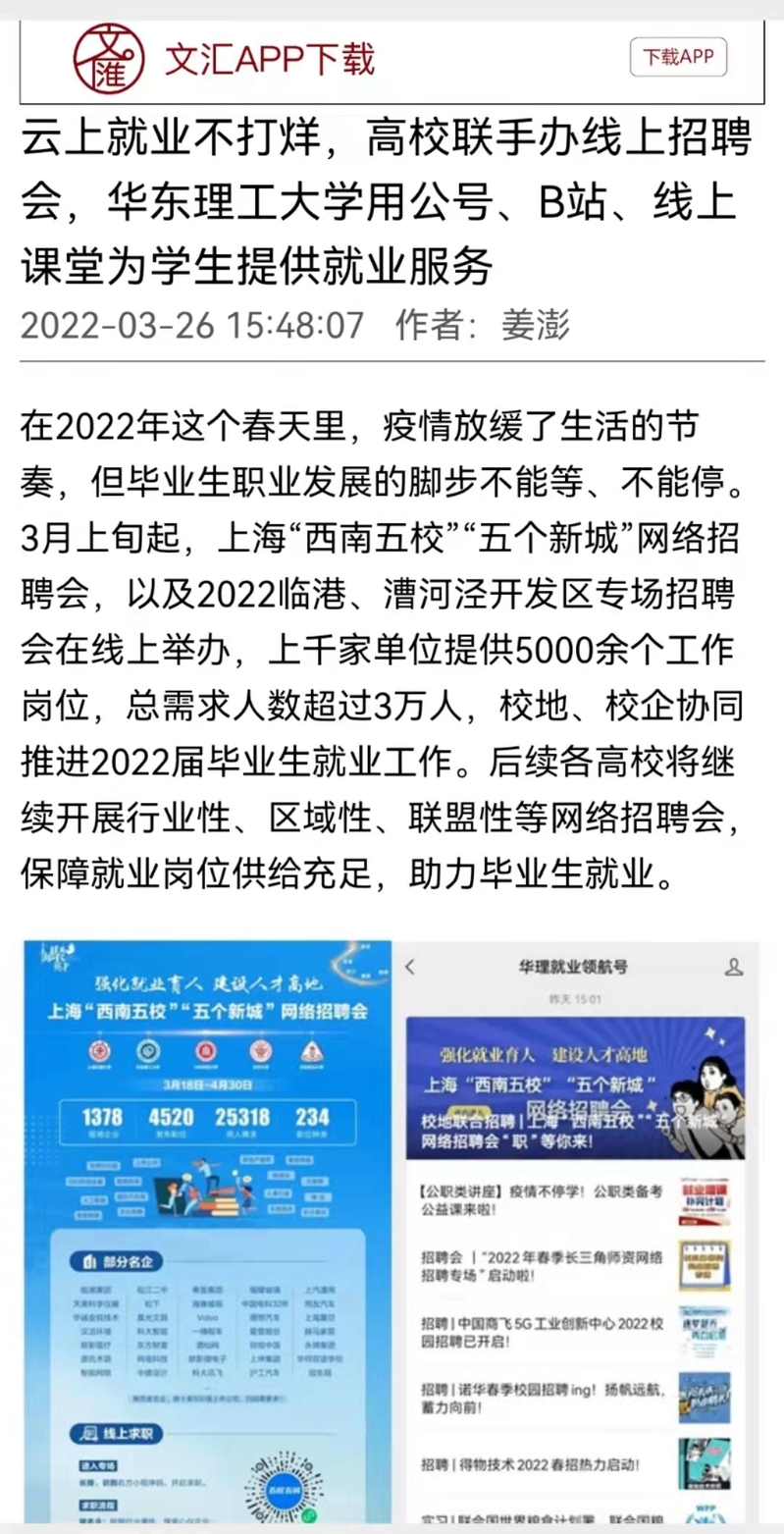 闭环管理期间,学工部学生就业指导服务中心第一时间启动“云就业”工作模式,不间断推出“云招聘”“云指导”“云服务”系列举措,做到就业服务不松懈、服务不断线、效果不打折,为2022届毕业生又快又好就业保驾护航。文汇APP、中国新闻网、新民晚报客户端、劳动观察、第一教育、上海科技报、话匣子等多家媒体进行了报道。本篇选取了部分报道予以转载。