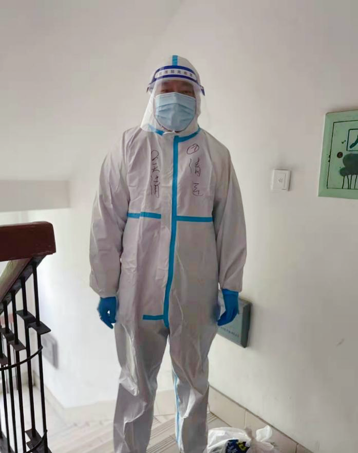 机动学院吴清老师在做好居家办公网上教学工作的同时,第一时间加入小区在职党员微信群,并报名参加志愿服务。在核酸检测时,他配合楼道长做好所在楼道秩序维护和安全提醒,主动参与小区物资发放、物资搬运、取送快递以及小区的垃圾清运等工作。在垃圾清运志愿服务时,他所负责的是没有电梯的楼道,最高要爬到6楼,防护服又闷又热,他都毫不退缩。
