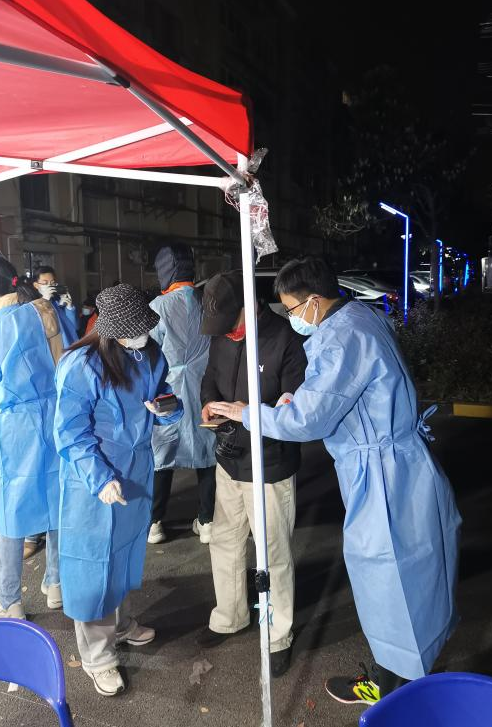 纪委办吴舜老师主动向所在社区居委请缨,担任了梅陇五村高层楼栋的入户志愿者,为小区居民落实“足不出户”的防疫要求提供坚实保障。挨家挨户“扫楼”是他的志愿日常,统计名单、订购蔬菜、取送快递、引导检测、分发物资......忙碌的身影穿梭在楼上楼下,只为守护好“责任田”的126户居民。遇到紧急、困难任务,他总是冲在前面。气温骤降、风雨来袭,他主动要求安排夜班,通宵值守,第二天一早又继续投入到抗原检测的志愿服务中。他说,防控疫情不容有失,共产党员要做基层战疫的排头兵!