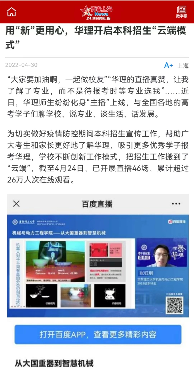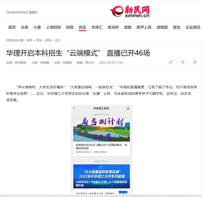 【新民网】华理开启本科招生“云端模式” 直播已开46场