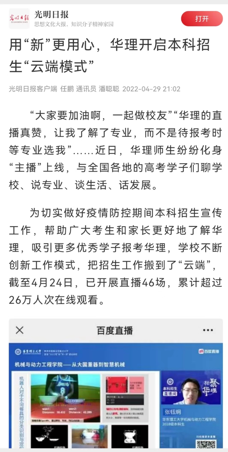 【光明日报客户端】用“新”更用心,华理开启本科招生“云端模式”