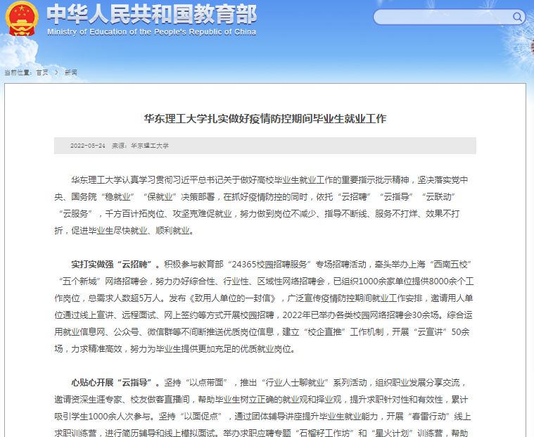 此次稿件由党委学生工作部(处)(武装部)学生就业指导服务中心提供,党委办公室编写上报教育部。
