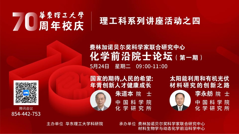 我校化学学科入选国家“双一流”建设学科和上海市二类高峰学科以来,发展快速,进步显著。为进一步加强化学学科高端平台建设、促进前沿学术交流,5月24日上午,由科学技术发展研究院主办,费林加诺贝尔奖科学家联合研究中心、材料生物学与动态化学前沿科学中心共同承办的“70周年校庆化学前沿院士论坛”在线上举行,我校杰出校友、中科院化学所朱道本院士和李永舫院士应邀为广大师生作了化学前沿学术报告。此次论坛是学校70周年校庆理工科系列讲座活动之一,副校长朱为宏教授主持论坛,田禾院士代表“联合研究中心”和“前沿科学中心”对两位院士表示了欢迎和感谢,来自校内外的300余名师生在线聆听了大家智慧。
