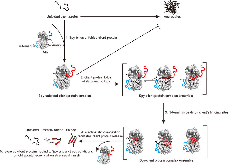 蛋白质错误折叠与聚集沉淀与多种人类疾病密切相关。分子伴侣是帮助蛋白正确折叠、抑制蛋白聚集沉淀、介导错误折叠蛋白降解的重要因子。掌握分子伴侣的作用机制,对于以分子伴侣为基础的新型疾病治疗手段的开发与优化具有至关重要的作用。分子伴侣Spy是一种较为原始的折叠型分子伴侣。我校生物工程学院全舒教授于2011年首次确立了Spy的分子伴侣功能并解析了其晶体结构(Quan et al.,Nat Struct Mol Biol, 2011, 18(3):262-269),又在2014年以Spy为研究对象阐明了分子伴侣的结构灵活性与分子伴侣活性的相关性(Quan, et al., eLife, 2014, 3:e01584)。随后,全舒团队在2020年与2021年又分别对Spy的抗聚集沉淀机制与生理底物进行了解析与鉴定(He et al., J Biol Chem, 2020, 295(42):14488-14500, He et al., mBio, 2021, 12(5):e0213021)。但至今为止,目前人们仍不清楚分子伴侣Spy如何不消耗能量而释放底物蛋白。