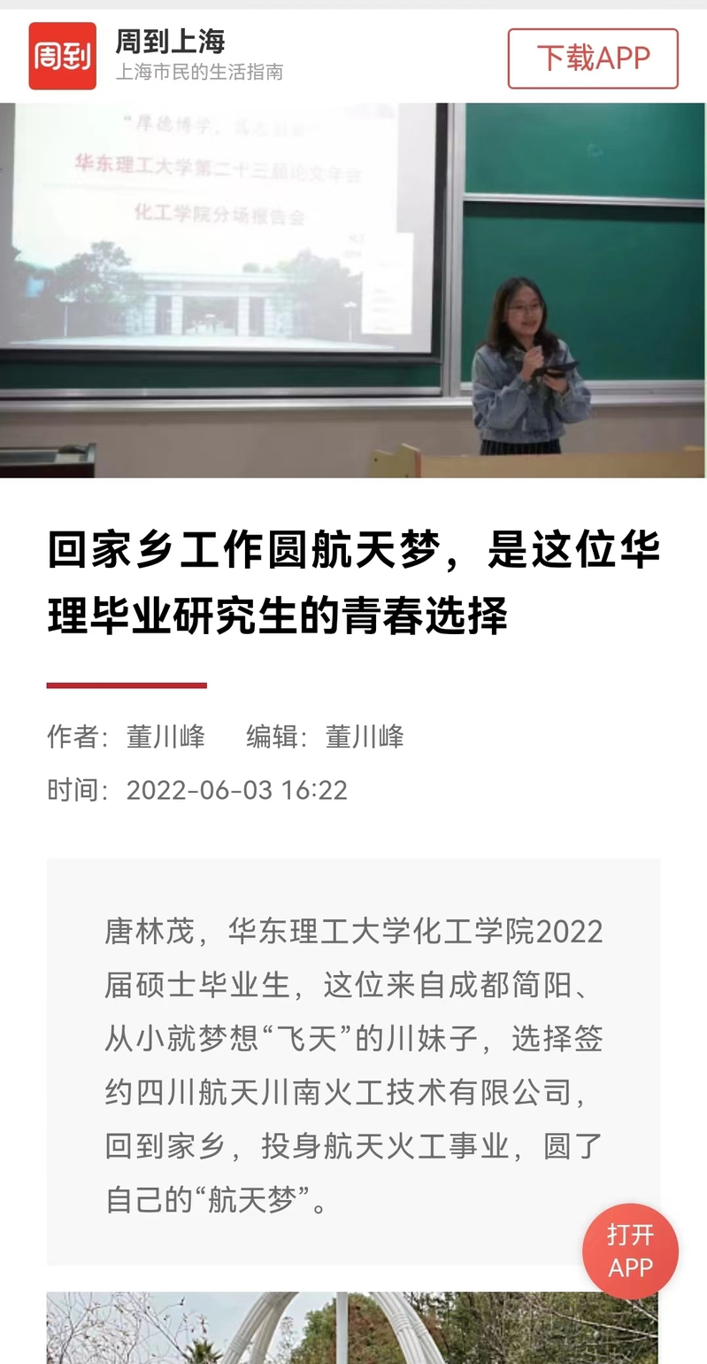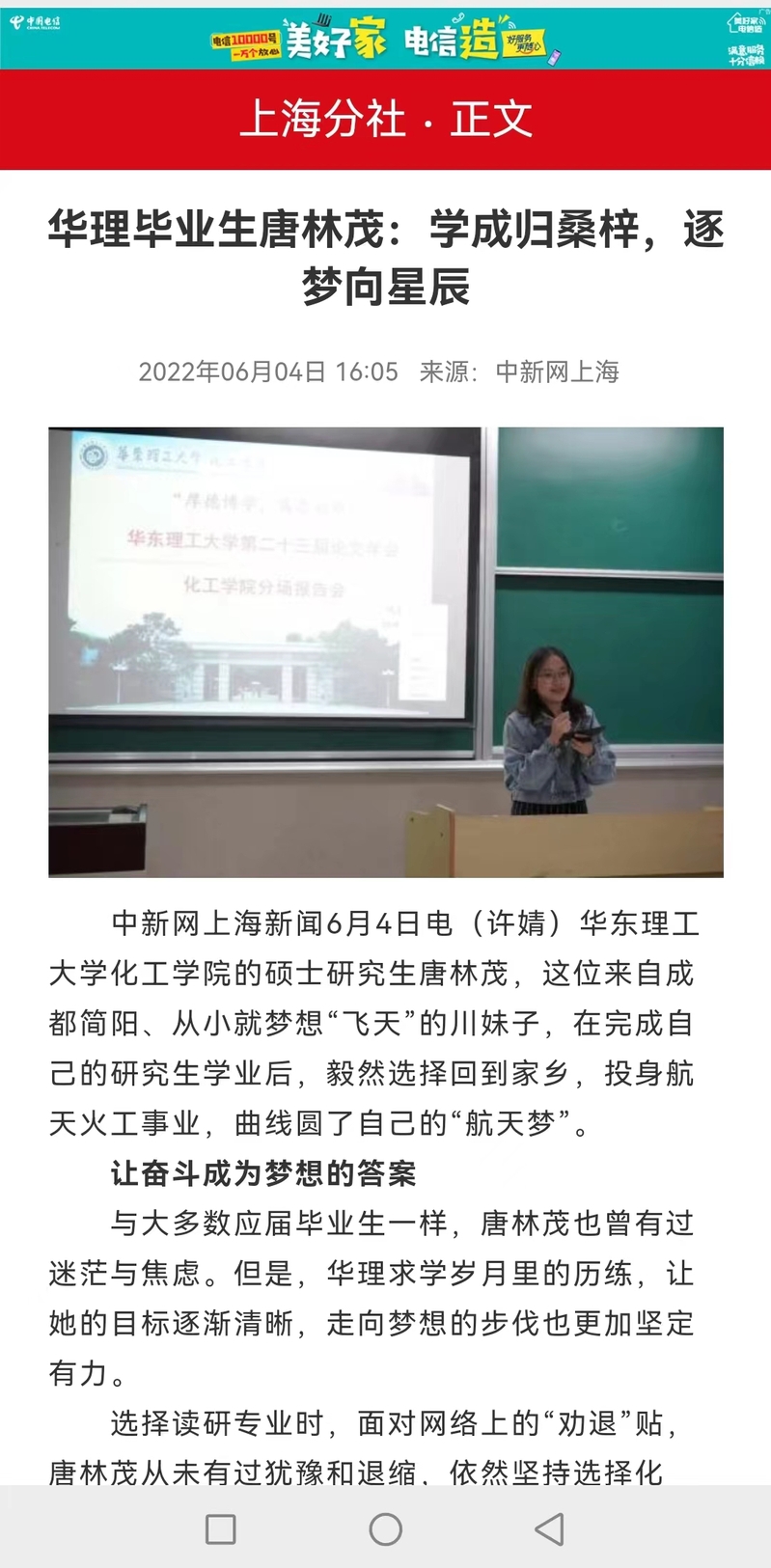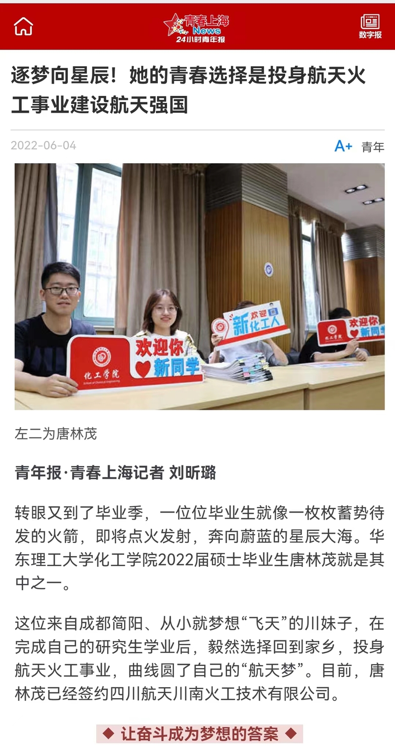 就业季中,我校化工学院2022届硕士毕业生唐林茂始终坚持自己的理想,毅然选择回到家乡,几经曲折最终签约四川航天川南火工技术有限公司投身航天火工事业,圆了自己的“航天梦”。中国新闻网、文汇APP、青春上海、新民晚报、周到上海、上海科技报等多家媒体进行了原发报道,本篇选取了部分报道予以转载。
