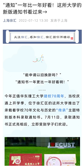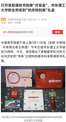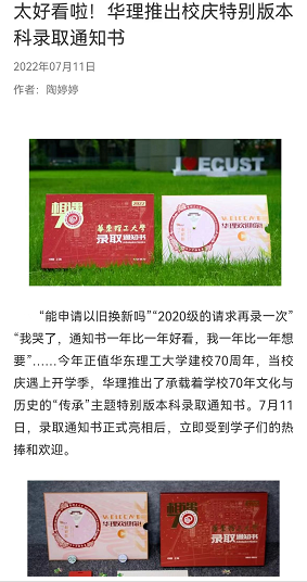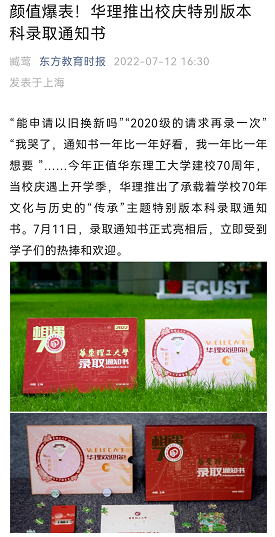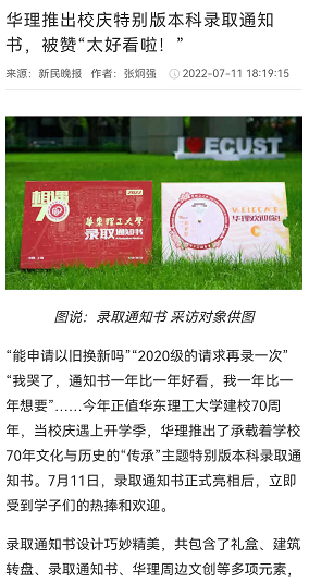 【新民晚报】华理推出校庆特别版本科录取通知书,被赞“太好看啦!”