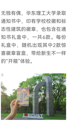 随录取通知书一同寄送的,还有精美的华理文创周边,卡套、明信片、徽章盲盒。其中最具趣味性的,是以华理地图为图案的拼图,在将70块拼图拼合的过程中,学子们能够一边熟悉校园,一边畅享未来,构建属于自己的理想蓝图。印有学校校徽和标志性建筑的徽章,也包含在通知书礼盒中,一共6款精美徽章,每份礼盒中随机出现其中2款惊喜徽章盲盒,带给新生不一样的“开箱”体验。