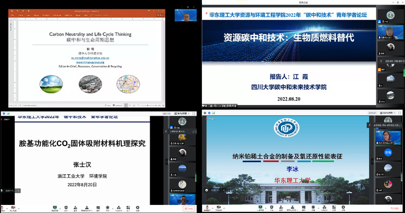 本次论坛立足国际科技前沿,围绕减污降碳协同增效、氢能绿色制造及利用等热点研究领域及行业产业的技术难题,展开了深入的探讨和交流。8月20日上午,会议特邀清华大学徐明教授、四川大学江霞教授、浙江工业大学张士汉教授、我校李冰教授分别作了“碳中和与生命周期思想”“资源碳中和技术:生物质燃料替代”“胺基功能化 CO2固体吸附材料机理探究”和“纳米铂稀土合金的制备及氧还原性能的研究”等主旨报告。