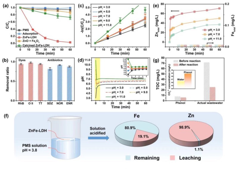 为了克服反应pH值对传统(类)芬顿反应的限制,邢明阳教授团队前期研究发现:通过在非均相芬顿催化剂表面化学负载MoS2,构建“表面酸性微环境”可显著减少催化剂表面吸附氢氧根(OHˉ)浓度,从而有效抑制表面铁离子发生水解反应,实现了宽pH响应降解有机污染物(Angew. Chem. Int. Ed., 2021, 60,17155;ESI高被引论文)。近日,该团队利用锌铁水滑石(ZnFe-LDH)中≡Zn(OH)2两性氧化物的性质,再次成功克服了反应pH值对(类)芬顿反应的限制。研究人员采用简单的共沉淀法制备了层状ZnFe-LDH,利用水滑石结构中两性氧化物≡Zn(OH)2发挥“牺牲剂效应”,在水滑石表面成功构建了具有缓冲作用的“中性微环境”。中性或碱性条件下,≡Zn(OH)2会竞争消耗催化剂表面吸附的OH¯,显著降低了≡Fe3+与吸附OH¯发生水解反应的几率,增加了≡Fe3+活化PMS生成≡FeIV=O的几率;而酸性条件下,≡Zn(OH)还能竞争消耗催化剂表面吸附的H+,有效抑制≡FeIV=O与H+发生副反应,促进表面≡Fe3+催化PMS持续生成≡FeIV=O,实现了3.0~11.0的宽pH范围内对酚类、染料类、抗生素类以及实际有机废水的高效降解。