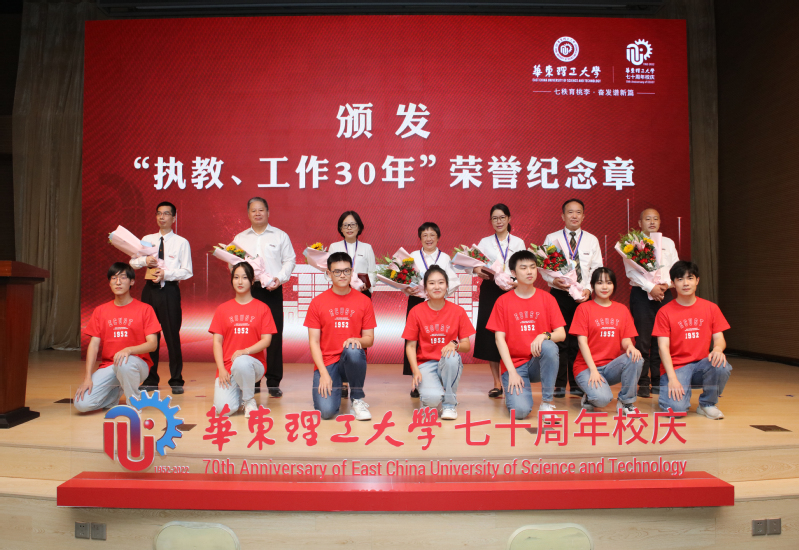 2022年,学校有29名在职教师在华理从事教育工作已满30年。三十年辛勤耕耘,他们不忘初心,扎根教育,为华理奉献自己的青春,与学校同发展共成长。会上,校领导为 “执教30年”“工作30年”教育工作者代表颁发纪念章,学生为他们献上鲜花。