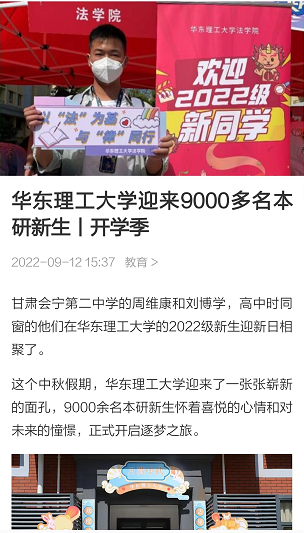9月10日、11日,华理迎来了9000余名本研新生,恰逢70周年校庆,华理围绕“七秩芳华,与‘理’相遇”这一主题,以喜迎党的二十大为契机,突出迎新工作的校庆特色,倡导绿色低碳,营造温馨浓郁的入学氛围。光明日报客户端、中国新闻网、新民晚报、第一教育、周到上海、东方网、上海科技报、021视频、青春上海、上海教育新闻网、劳动观察等媒体原发报道10余篇,对我校2022年本研迎新相关情况进行了报道。